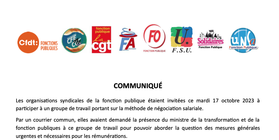 Les organisations syndicales de la fonction publique étaient invitées ce mardi 17 octobre 2023 à participer à un groupe de travail portant sur la méthode de négociation salariale.