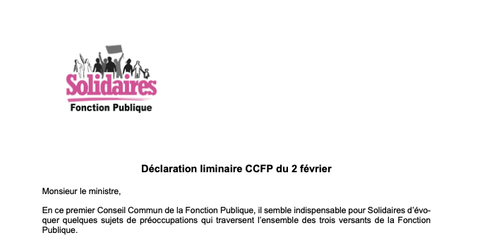 En ce premier Conseil Commun de la Fonction Publique, il semble indispensable pour Solidaires d’évoquer quelques sujets de préoccupations qui traversent l’ensemble des trois versants de la Fonction Publique.