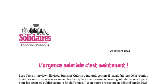 Alors que les mouvements de grève et de contestation se multiplient et s’amplifient, que la situation quotidienne de la population et notamment des agent-es publics se dégrade chaque jour compte-tenu d’une inflation galopante, que les tarifs de l’énergie augmenteront de 15% à partir de début janvier, que les agent-es publics se verront inciter à télétravailler plus au cours de l’hiver, avec une indemnité largement insuffisante, le ministre ne veut toujours rien entendre de l’urgence salariale dans la fonction publique.