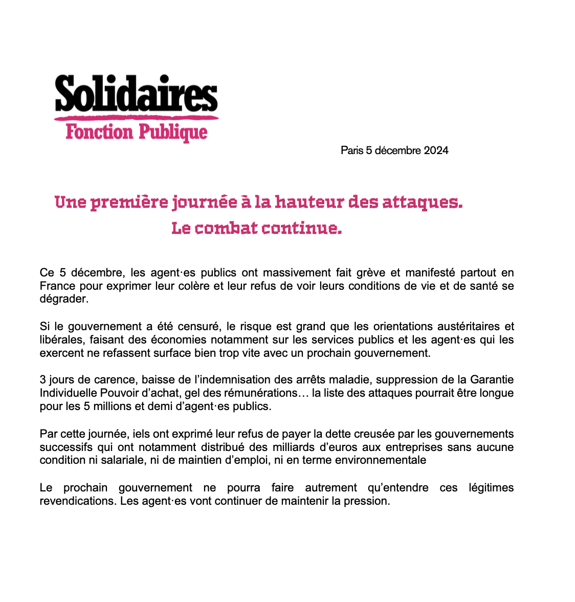 Si le gouvernement a été censuré, le risque est grand que les orientations austéritaires et libérales, faisant des économies notamment sur les services publics et les agent·es qui les exercent ne refassent surface bien trop vite avec un prochain gouvernement.