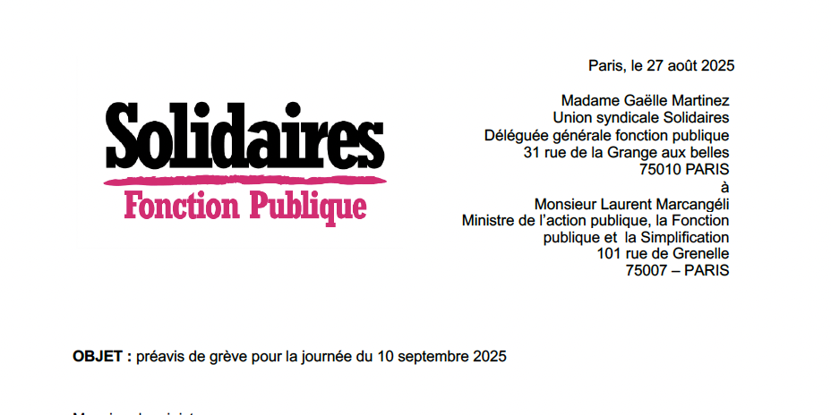 L’Union syndicale Solidaires Fonction publique dépose un préavis de grève pour la journée du 10 septembre (de 0 h à 24 h).