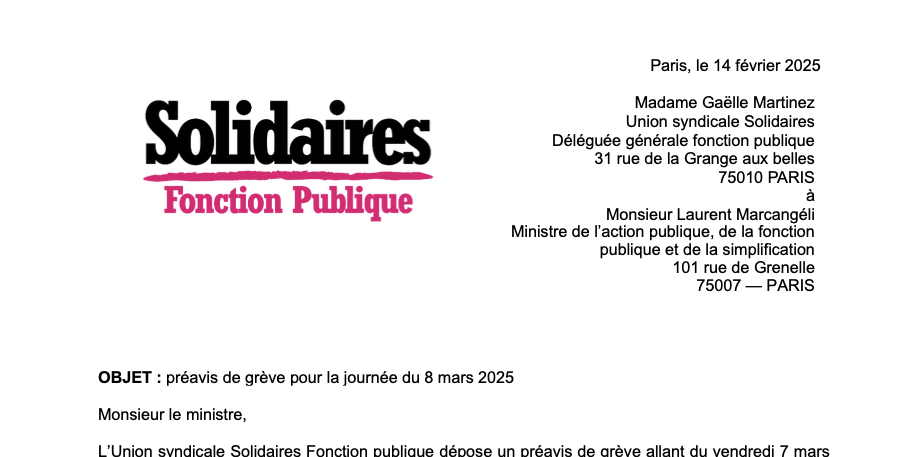 L’Union syndicale Solidaires Fonction publique dépose un préavis de grève allant du vendredi 7 mars 2025 19h au dimanche 9 mars 2025 9h.