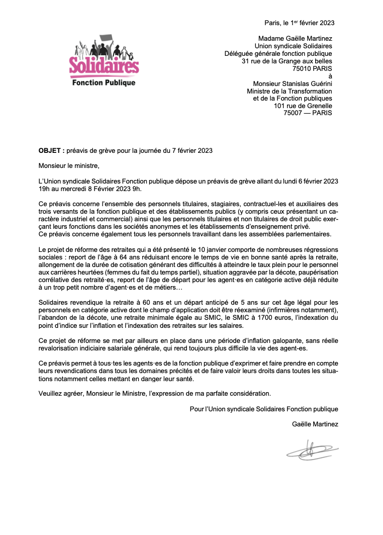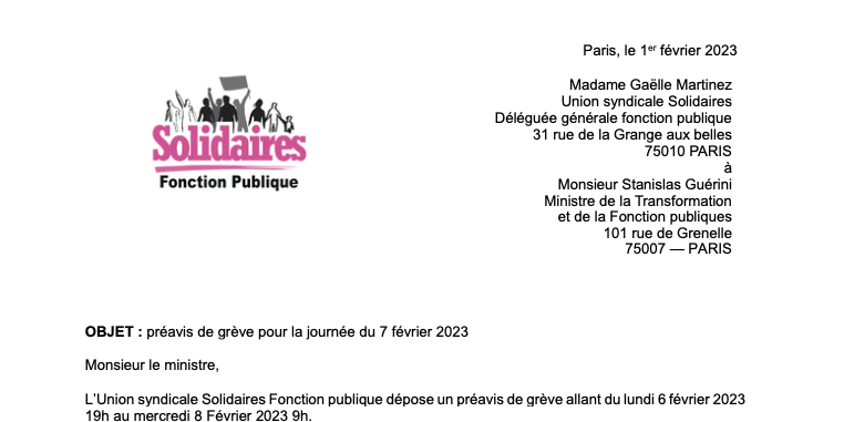 L’Union syndicale Solidaires Fonction publique dépose un préavis de grève allant du lundi 6 février 2023 19h au mercredi 8 Février 2023 9h.