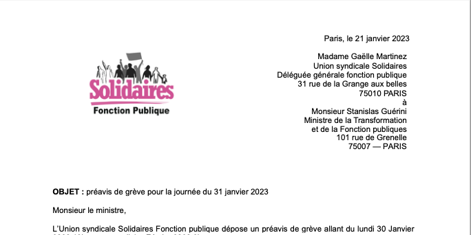 L’Union syndicale Solidaires Fonction publique dépose un préavis de grève allant du lundi 30 Janvier 2023 19h au mercredi 1er Février 2023 9h.