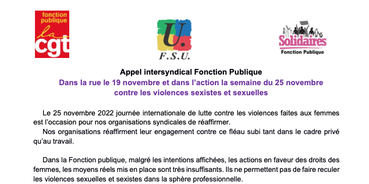 Appel intersyndical Fonction Publique Dans la rue le 19 novembre et dans l’action la semaine du 25 novembre contre les violences sexistes et sexuelles