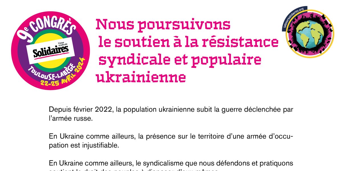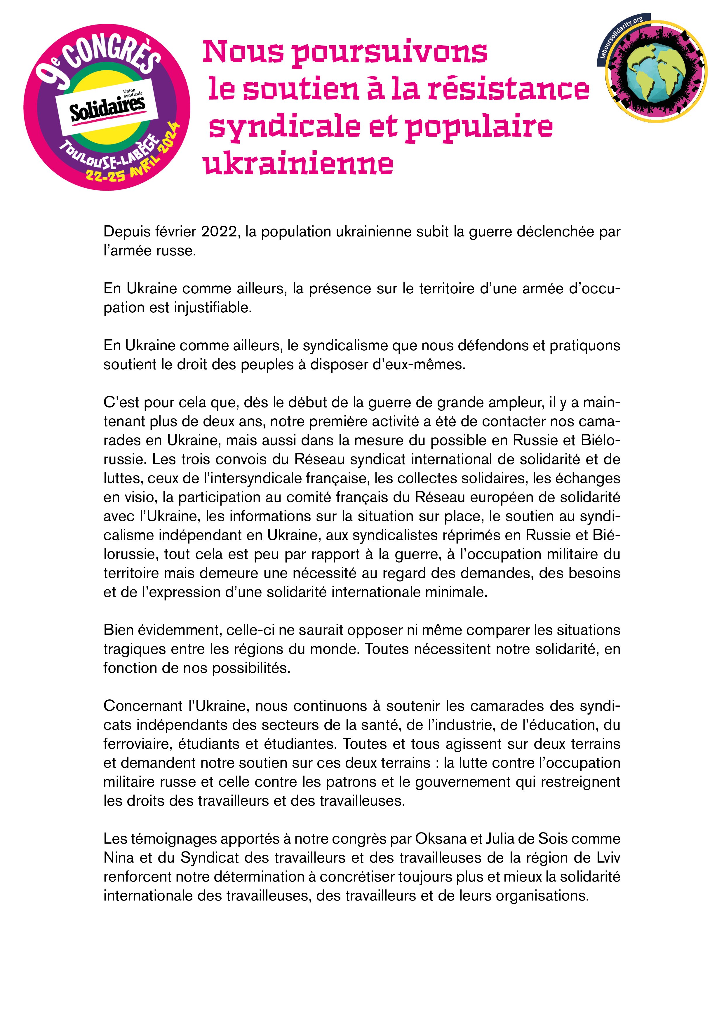 Les témoignages apportés à notre congrès par Oksana et Julia de Sois comme Nina et du Syndicat des travailleurs et des travailleuses de la région de Lviv renforcent notre détermination à concrétiser toujours plus et mieux la solidarité internationale des travailleuses, des travailleurs et de leurs organisations.