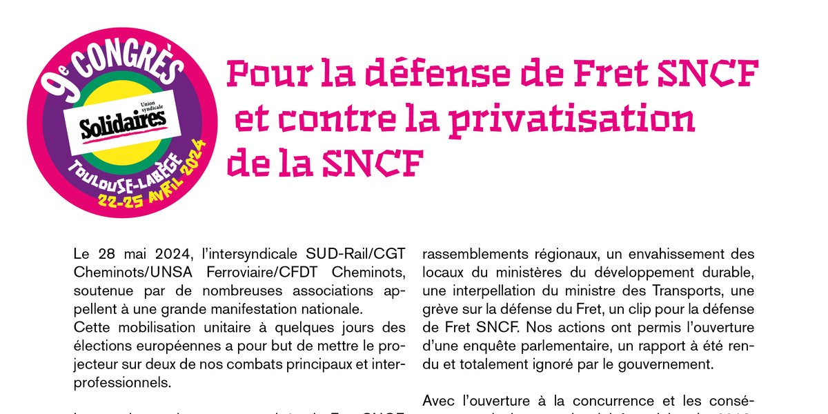 Le 28 mai 2024, l’intersyndicale SUD-Rail/CGT Cheminots/UNSA Ferroviaire/CFDT Cheminots, soutenue par de nombreuses associations appellent à une grande manifestation nationale.