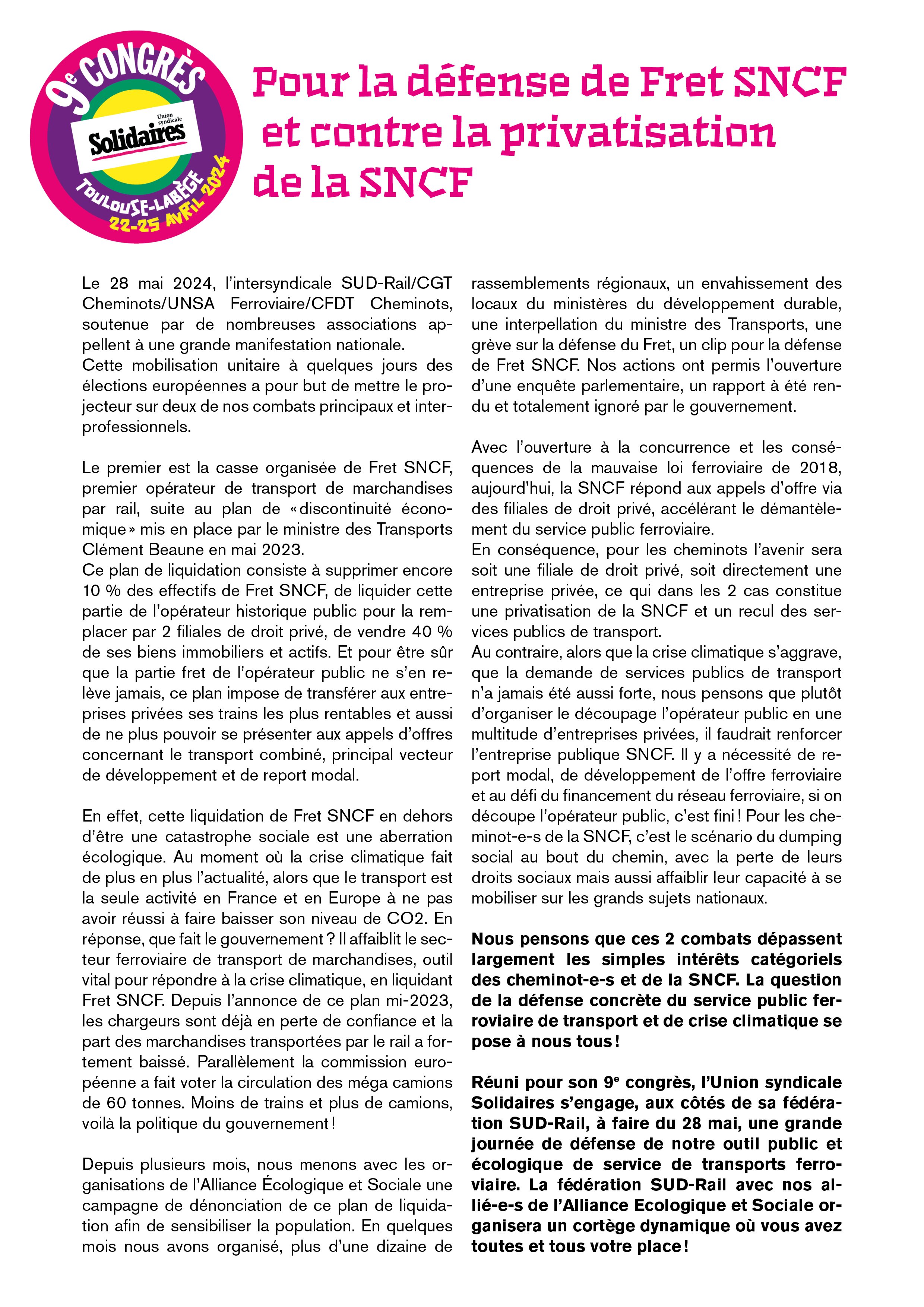 Réuni pour son 9e congrès, l’Union syndicale Solidaires s’engage, aux côtés de sa fédération SUD-Rail, à faire du 28 mai, une grande journée de défense de notre outil public et écologique de service de transports ferroviaire. La fédération SUD-Rail avec nos allié-e-s de l’Alliance Ecologique et Sociale organisera un cortège dynamique où vous avez toutes et tous votre place !