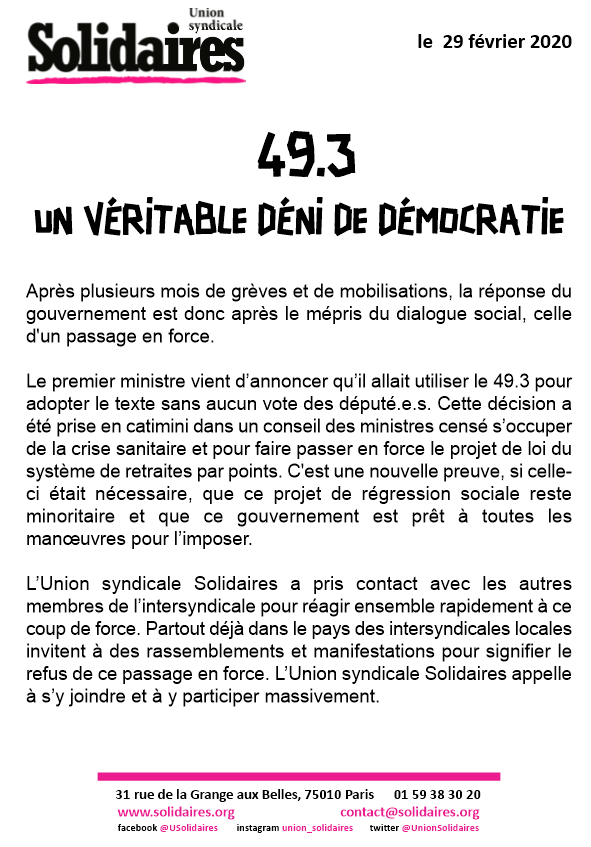 Le premier ministre vient d’annoncer qu’il allait utiliser le 49.3 pour adopter le texte sans aucun vote des député.e.s. Cette décision a été prise en catimini dans un conseil des ministres censé s’occuper de la crise sanitaire et pour faire passer en force le projet de loi du système de retraites par points. C'est une nouvelle preuve, si celle-ci était nécessaire, que ce projet de régression sociale reste minoritaire et que ce gouvernement est prêt à toutes les manœuvres pour l’imposer.