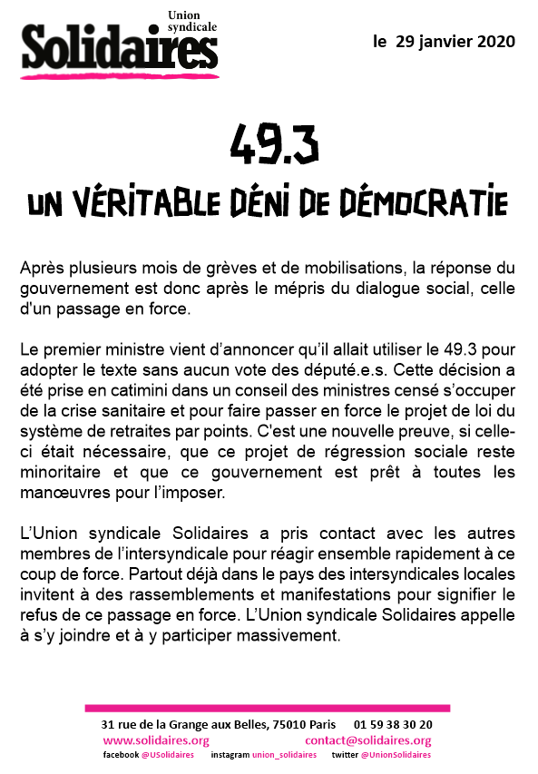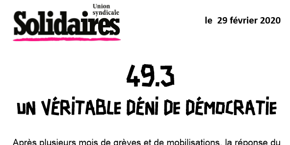 Le premier ministre vient d’annoncer qu’il allait utiliser le 49.3 pour adopter le texte sans aucun vote des député.e.s. Cette décision a été prise en catimini dans un conseil des ministres censé s’occuper de la crise sanitaire et pour faire passer en force le projet de loi du système de retraites par points. C'est une nouvelle preuve, si celle-ci était nécessaire, que ce projet de régression sociale reste minoritaire et que ce gouvernement est prêt à toutes les manœuvres pour l’imposer.