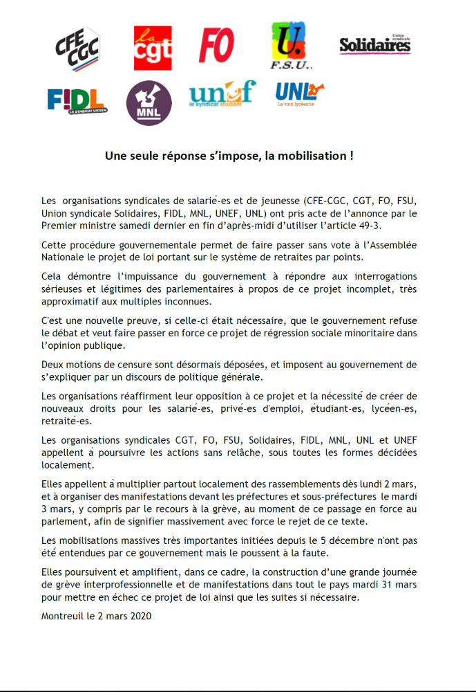 Les organisations syndicales de salarié-es et de jeunesse (CFE-CGC, CGT, FO, FSU, Union syndicale Solidaires, FIDL, MNL, UNEF, UNL) ont pris acte de l’annonce par le Premier ministre samedi dernier en fin d’après-midi d’utiliser l’article 49-3.