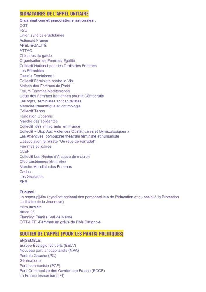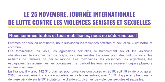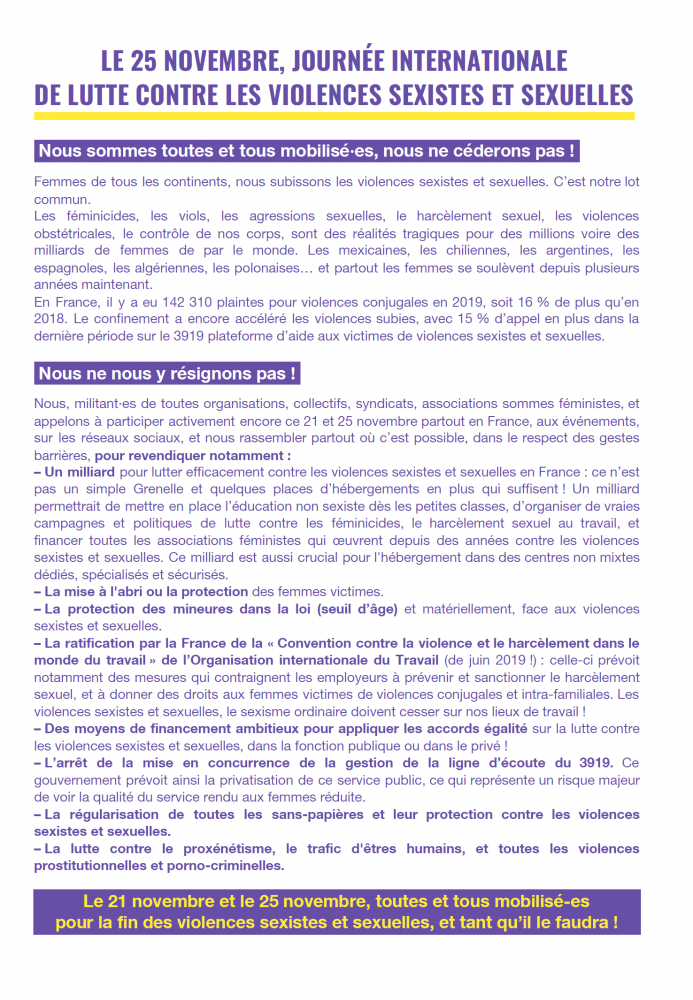 Nous, militant·es de toutes organisations, collectifs, syndicats, associations sommes féministes, et appelons à participer activement encore ce 21 et 25 novembre partout en France, aux événements, sur les réseaux sociaux, et nous rassembler partout où c’est possible, dans le respect des gestes barrières,