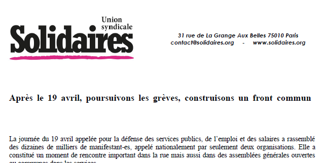 La journée du 19 avril appelée pour la défense des services publics, de l’emploi et des salaires a rassemblé des dizaines de milliers de manifestant-es, appelé nationalement par seulement deux organisations. Elle a constitué un moment de rencontre important dans la rue mais aussi dans des assemblées générales ouvertes ou communes dans les services.