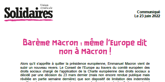 En effet, alors qu’elle ne devrait être qu’un socle minimal de droits sociaux pour l’ensemble des peuples composant l’union européenne, cette charte sociale est devenue au fil des ans un texte auquel même les acteurs sociaux français se réfèrent pour tenter de faire sanctionner les destructeurs hexagonaux du Code du travail ! Cette décision souligne également à quel point notre haute cour de justice peut être d’une grande utilité aux puissants et que toute Cour de Cassation qu’elle est, elle n’a pas hésité à valider malgré l’injustice faite aux droits des travailleurs-euses le dispositif du barème, jugeant notamment que la Charte européenne n’avait pas d’« effet direct » en droit français. Il n’est sans doute pas inutile de rappeler qu’une telle décision a été rendue alors qu’Emmanuel Macron venait de se faire réélire pour 5 années supplémentaires… Qu’elle est loin l’indépendance de la justice dans notre pays !