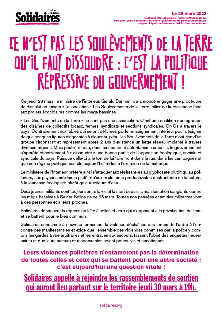 Deux jeunes militants sont toujours entre la vie et la mort depuis la manifestation sanglante contre les méga bassines à Sainte-Soline de ce 25 mars. Toutes nos pensées et amitiés militantes vont à ces personnes et à leurs proches.
