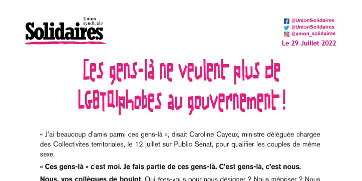 En nommant Caroline Cayeux et en la maintenant à son poste, le Président de la République commet encore une fois une faute grave. Tout comme en maintenant Christophe Béchu, ministre de la Transition écologique et de la Cohésion des territoires signataire d’une tribune contre le mariage pour tous et toutes parue dans « Valeurs actuelles » en 2012, avant d’interdire, en 2016, des affiches de prévention contre le VIH dans sa ville d’Angers. Sans oublier Gérald Darmanin, qui déclarait jadis refuser de marier des couples de même sexe à la mairie de Tourcoing.