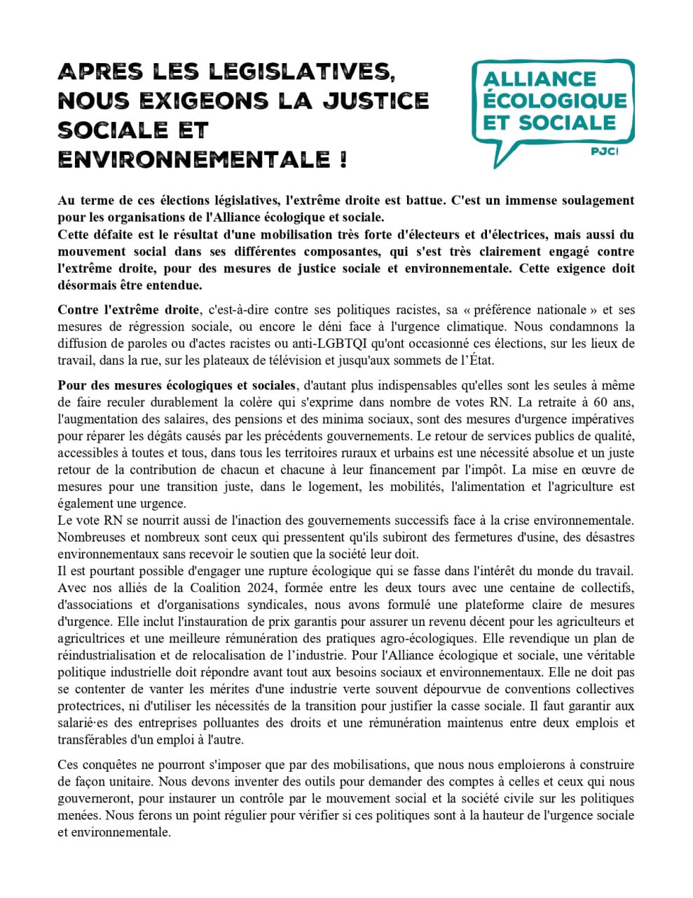 Communiqué à lire sur le site de l'Alliance Ecologique et Sociale : https://alliance-ecologique-sociale.org/apres-les-legislatives-nous-exigeons-la-justice-sociale-et-environnementale/ et ci-dessous