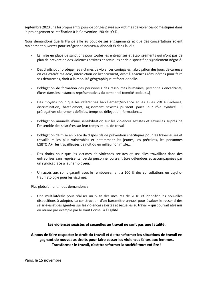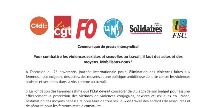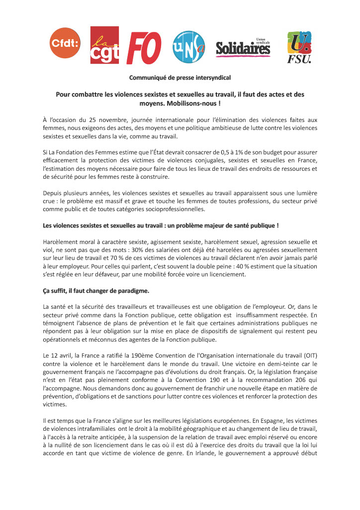 Communiqué de presse intersyndical: Pour combattre les violences sexistes et sexuelles au travail, il faut des actes et des moyens. Mobilisons-nous !