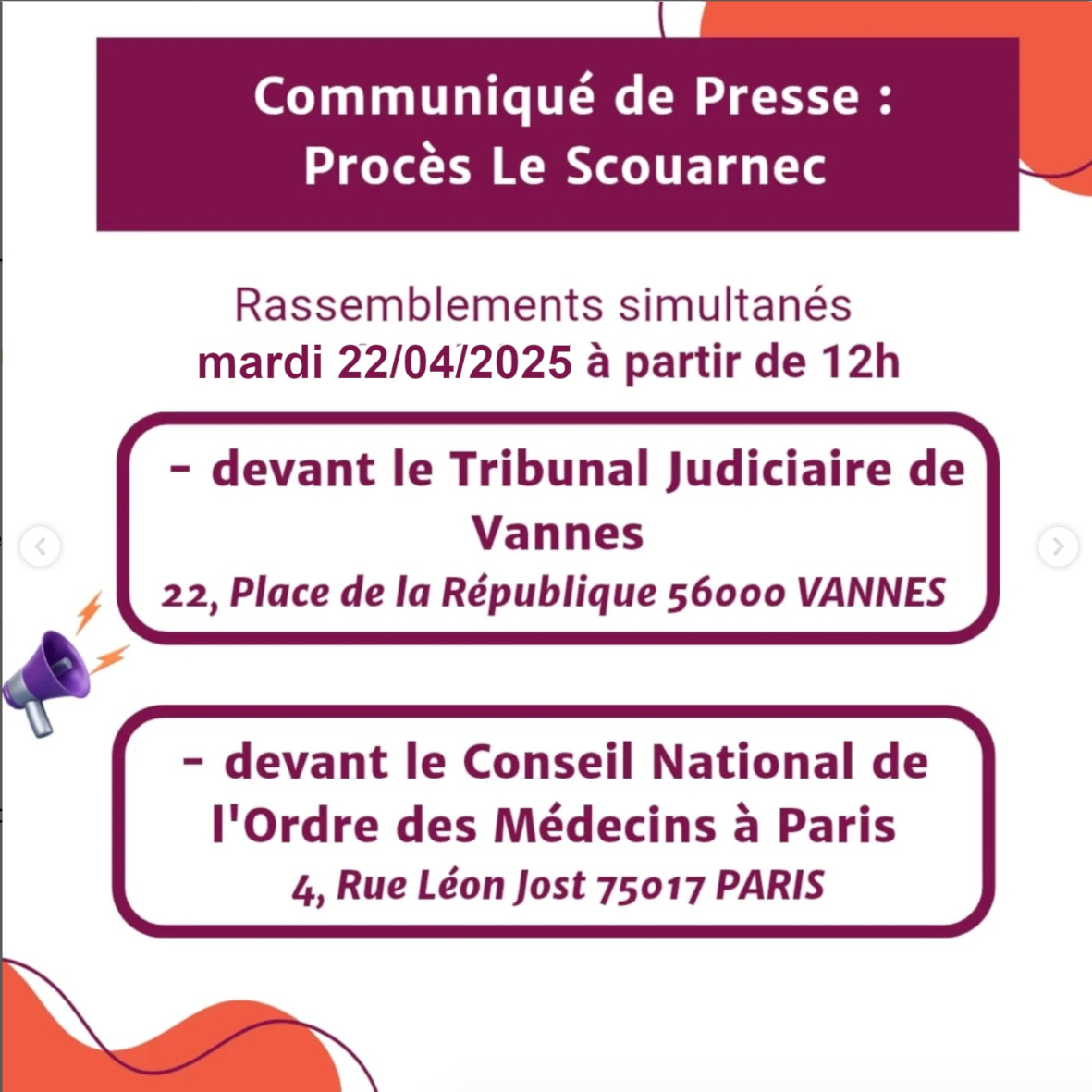 Nous appelons à un rassemblement le 22 avril 2025 à partir de 12 heures, devant le Tribunal Judiciaire de Vannes et devant le Conseil national de l'Ordre des médecins à Paris.