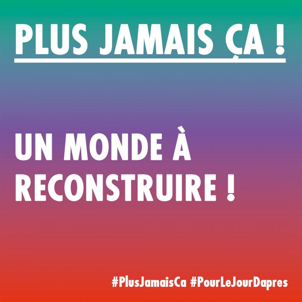 Le collectif « Plus jamais ça » est composé d’organisations syndicales, d’associations et d’ONGs qui ont décidé de converger pour construire des propositions et mener des initiatives autour de la double urgence sociale et environnementale. Ces organisations ont construit ensemble un « Plan de sortie de crise » articulé autour de 34 mesures prenant en compte ces deux exigences. Indépendantes des partis politiques, elles estiment que face aux crises sanitaires, environnementales et sociales, il y a bien urgence à porter ces propositions de transformation radicale de la société, et que celles-ci doivent alimenter le débat politique.