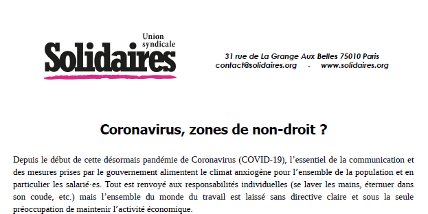 Depuis quelques jours, de nombreux ministres et autres responsables politiques ou économiques se répandent dans les médias et affirment de manière péremptoire que le droit de retrait dans le cas de cette pandémie ne se justifie pas... Ils ont commencé cette communication depuis que dans certains secteurs, de la culture et du transport notamment, des salarié-es ont commencé à l’exercer pour obtenir de la part de leurs employeurs des mesures de prévention. Pour Solidaires, les choses sont très claires, si l’employeur privé ou public conteste la réalité du danger, seul un juge pourra trancher le litige, ce n’est d’aucune façon à lui de dire si l’utilisation de ce droit est justifiée ou non. C’est d’ailleurs un principe constitutionnel en ce qui concerne les employeurs publics, la séparation des pouvoirs.