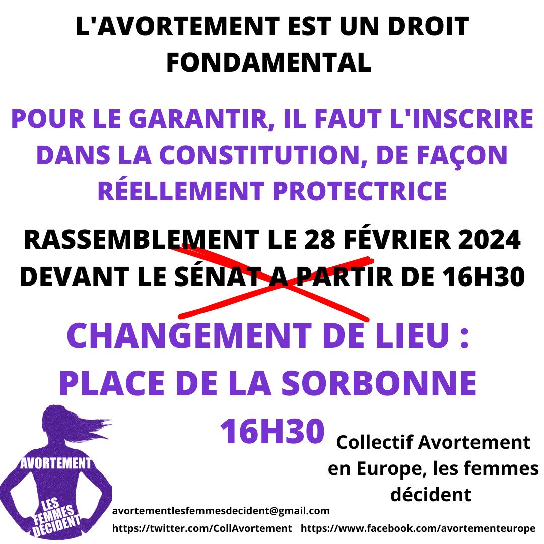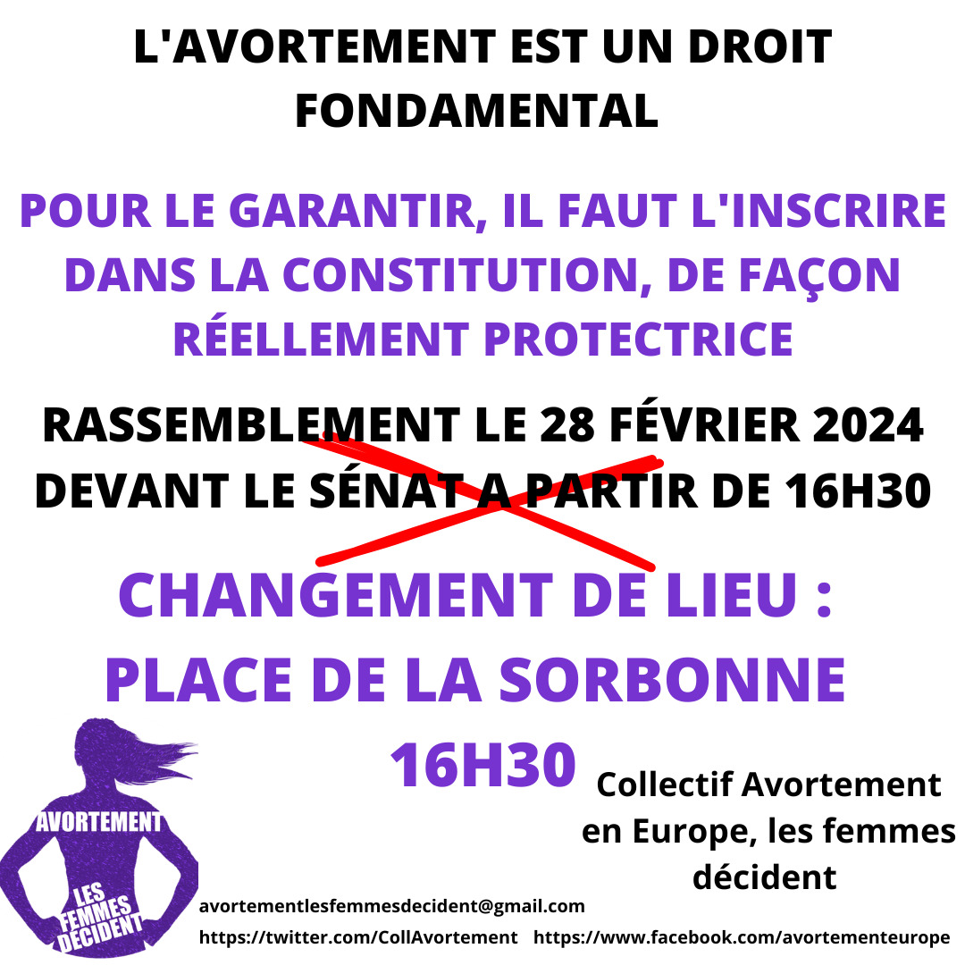 CP du Collectif Avortement Europe : constitutionnalisation du droit à l'IVG, halte à l'obstruction ! rassemblement place de la Sorbonne le 28 février à 16h30