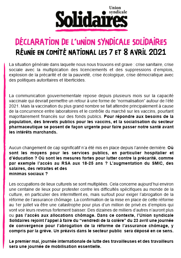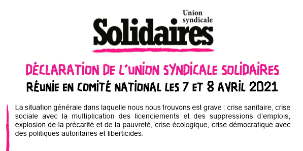 Déclaration de l’Union syndicale Solidaires réunie en comité national les 7 et 8 avril 2021