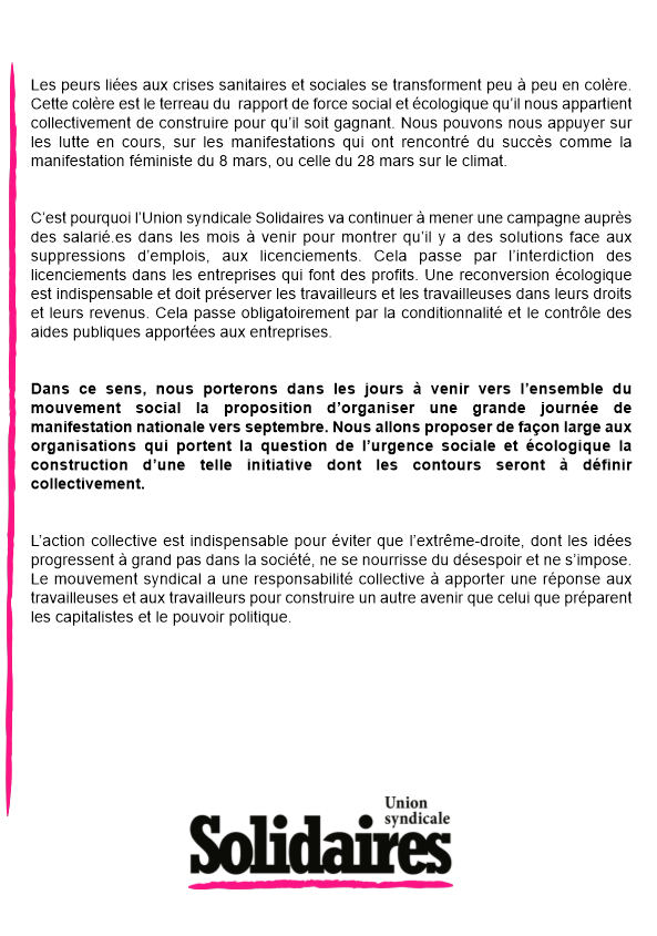 Le comité national de Solidaires réaffirme que des mesures d'urgences pour répondre aux crises sanitaires et sociales sont indispensables. Solidaires rejoint l'appel au 23 avril de lutte contre la réforme de l'assurance chômage. Le premier mai doit être une journée de forte mobilisation. Le comité national, face à l'urgence sociale et écologique, va proposer à l'ensemble du mouvement social d'organiser une grande journée de manifestation en septembre.