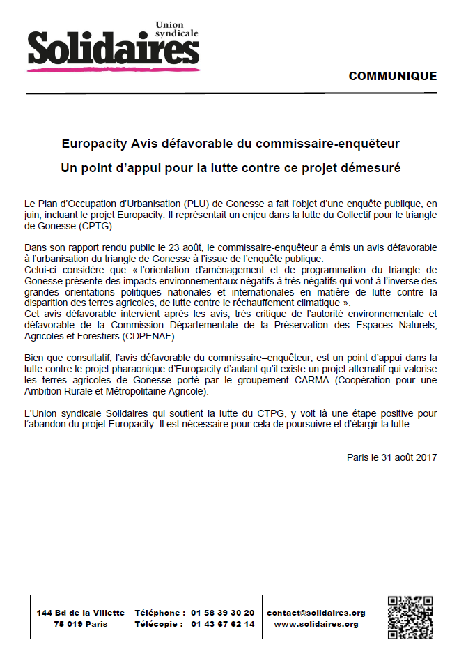 Europacity : Avis défavorable du commissaire-enquêteur - Un point d’appui pour la lutte contre ce projet démesuré
