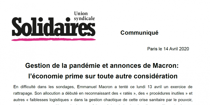 Depuis le 17 mars, voici les pratiques patronales qui nous remontent, via le Numéro vert* et l’engagement sur le terrain de nos militant-es : des règles de santé au travail bafouées en obligeant les personnes à travailler sans protection, des fraudes au chômage partiel et des ruptures abusives en périodes d’essai, des pressions et chantages sur le droit de retrait, les congés… tout cela en totale impunité. Les travailleurs/euses paient déjà un lourd tribut économique et social à cette situation sanitaire. Les annonces ne répondent aucunement à ces situations bien concrètes depuis un mois, qui vont tendre à s’accélérer avec une reprise du travail fixée au 11 mai, dans un flou dangereux. Et aucun mot sur la date d’une fin des dérogations au droit du travail qui sont sans précédent!