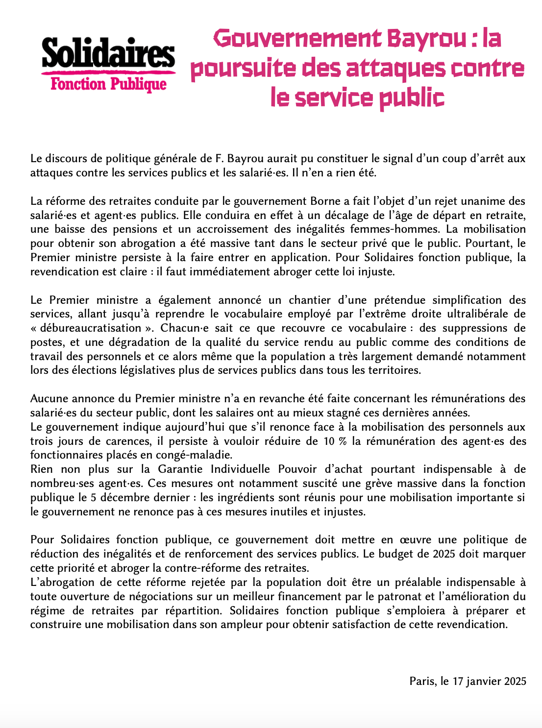 Pour Solidaires fonction publique, ce gouvernement doit mettre en œuvre une politique de réduction des inégalités et de renforcement des services publics. Le budget de 2025 doit marquer cette priorité et abroger la contre-réforme des retraites.