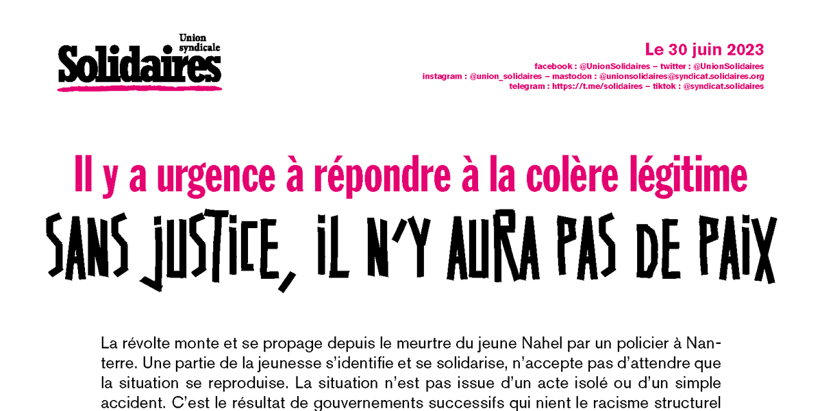 La révolte monte et se propage depuis le meurtre du jeune Nahel par un policier à Nanterre. Une partie de la jeunesse s’identifie et se solidarise, n’accepte pas d’attendre que la situation se reproduise. La situation n’est pas issue d’un acte isolé ou d’un simple accident. C’est le résultat de gouvernements successifs qui nient le racisme structurel et le système des violences policières. C’est le résultat de décennies de politiques répressives, héritières des pratiques de gestion coloniale des populations, qui se retrouvent dans la gestion des quartiers populaires. C’est le résultat des inégalités sociales et territoriales, de la destruction des services publics, de la masse des logements indignes, du démantèlement du tissu associatif, qui concerne au quotidien des millions de travailleuses et travailleurs.