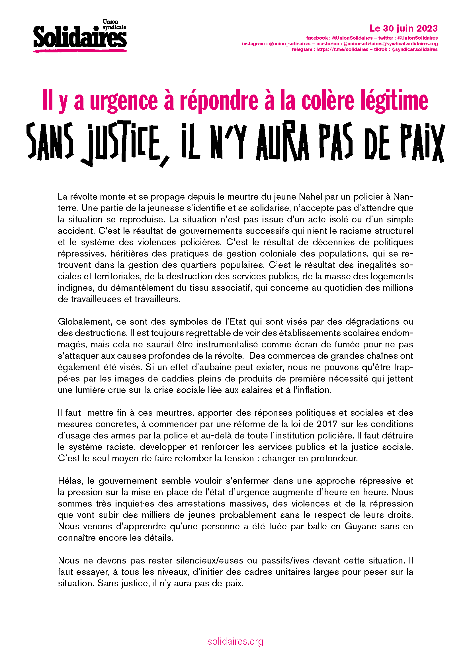 Hélas, le gouvernement semble vouloir s’enfermer dans une approche répressive et la pression sur la mise en place de l'état d’urgence augmente d’heure en heure. Nous sommes très inquiet·es des arrestations massives, des violences et de la répression que vont subir des milliers de jeunes probablement sans le respect de leurs droits. Nous venons d’apprendre qu’une personne a été tuée par balle en Guyane sans en connaître encore les détails.
