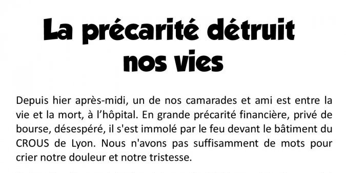 Nous relayons le communiqué de la fédération Solidaires étudiant quand à la situation d'un de ses membres, camarade de notre union, qui s'est immolé hier à Lyon par désespoir devant la situation sociale qu'il subissait.