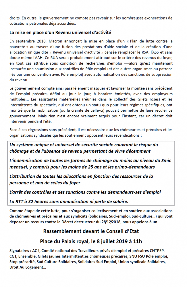 Communiqué AC ! - APEIS - MNCP - Recours Radiation - CGT Chômeurs - SAF - Solidaires - Solidaires SUD Emploi - SUD Culture Solidaires annonçant notre action judiciaire commune contre le décret du 28 décembre 2018 lequel renforce drastiquement les sanctions contre les chômeur-euses et détruit toujours plus les missions de service public de Pôle Emploi. Ce communiqué évoque et dénonce à cette occasion la réforme de l'assurance chômage annoncée par le gouvernement laquelle continue de laminer les droits des plus modestes. Il annonce enfin notre rassemblement et notre conférence de presse le 8 juillet prochain devant le Conseil d'Etat à 11h à l'occasion du dépôt des différentes interventions volontaires contre le décret.-----------------------------