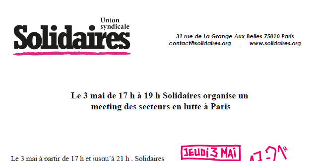 Le 3 mai de 17 h à 19 h Solidaires organise un meeting des secteurs en lutte à Paris