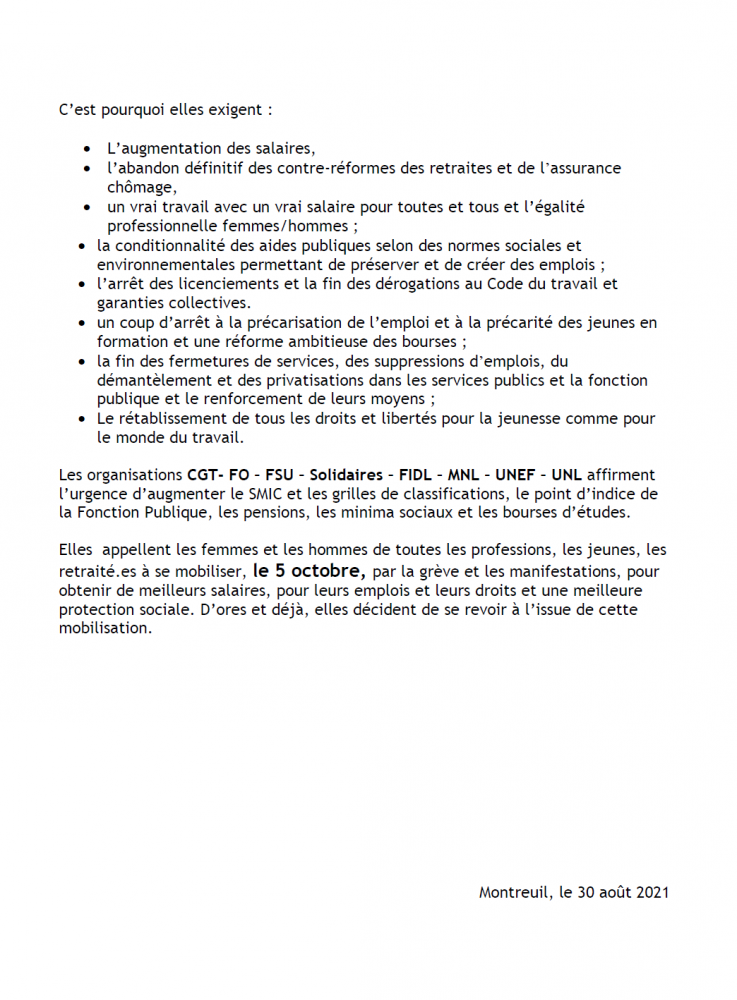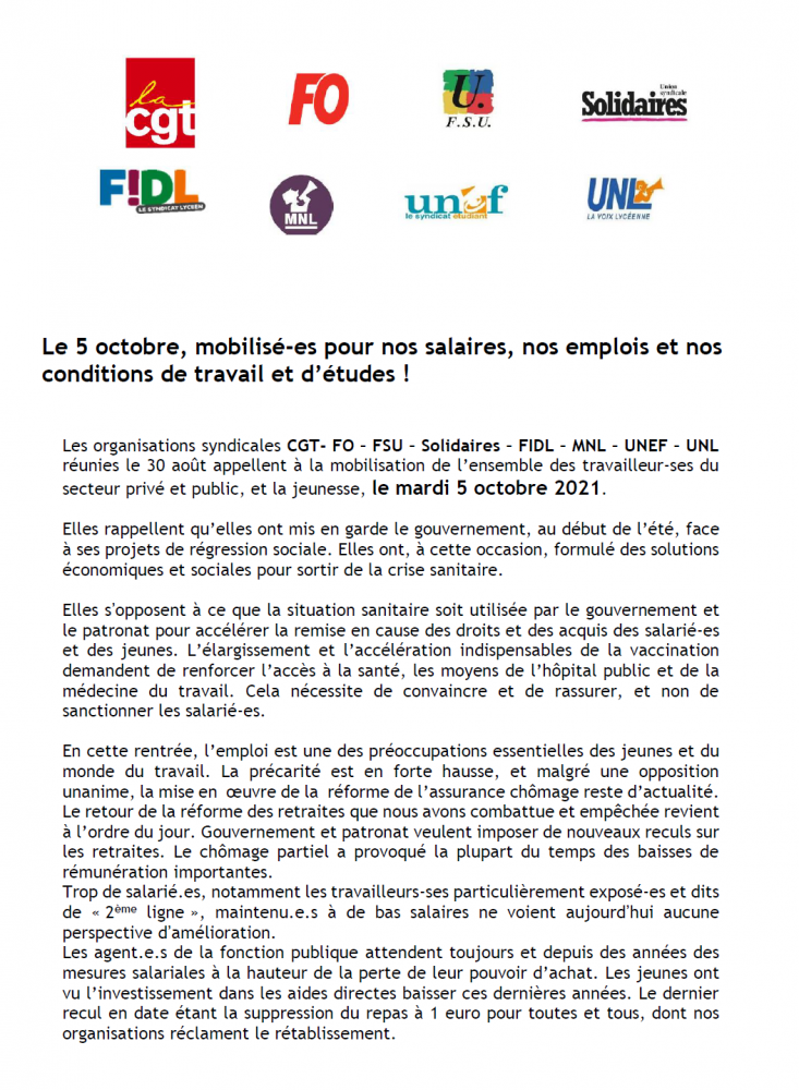 réunies le 30 août appellent à la mobilisation de l’ensemble des travailleur-ses du secteur privé et public, et la jeunesse, le mardi 5 octobre 2021.