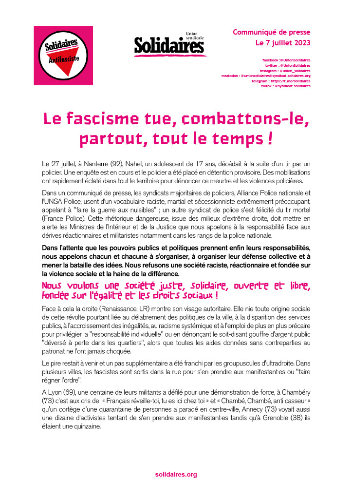 Dans un communiqué de presse, les syndicats majoritaires de policiers, Alliance Police nationale et l’UNSA Police, usent d’un vocabulaire raciste, martial et sécessionniste extrêmement préoccupant, appelant à "faire la guerre aux nuisibles" ; un autre syndicat de police s'est félicité du tir mortel (France Police). Cette rhétorique dangereuse, issue des milieux d’extrême droite, doit mettre en alerte les Ministres de l’Intérieur et de la Justice que nous appelons à la responsabilité face aux dérives réactionnaires et militaristes notamment dans les rangs de la police nationale.