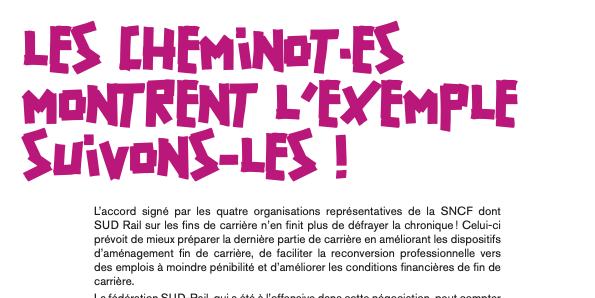 L’accord signé par les quatre organisations représentatives de la SNCF dont SUD Rail sur les fins de carrière n’en finit plus de défrayer la chronique ! Celui-ci prévoit de mieux préparer la dernière partie de carrière en améliorant les dispositifs d'aménagement fin de carrière, de faciliter la reconversion professionnelle vers des emplois à moindre pénibilité et d’améliorer les conditions financières de fin de carrière.