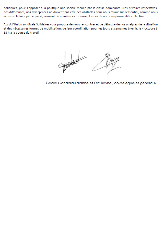Aussi, l’Union syndicale Solidaires vous propose de nous rencontrer et de débattre de nos analyses de la situation et des nécessaires formes de mobilisation, de leur coordination pour les jours et semaines à venir, le 4 octobre à 18 h à la bourse du travail.