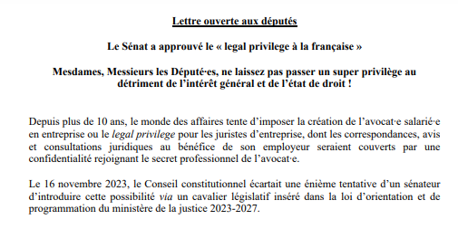 Lettre ouverte aux député∙es signée par CGT, FSU, Solidaires, SAF, SM, Global Chance, ANV COP 21 et Alternatiba contre le projet de créer l’avocat∙e salarié∙e en entreprise ou le legal privilege pour les juristes d’entreprise, dont les correspondances, avis et consultations juridiques au bénéfice de leur employeur seraient couverts par la confidentialité des consultations et avis qu'ils et elles produisent pour lui.