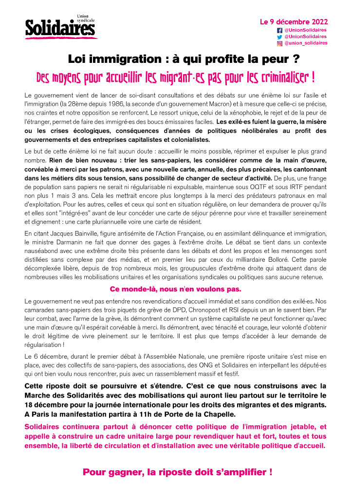 Cette riposte doit se poursuivre et s'étendre. C’est ce que nous construisons avec la Marche des Solidarités avec des mobilisations qui auront lieu partout sur le territoire le 18 décembre pour la journée internationale pour les droits des migrantes et des migrants. A Paris la manifestation partira à 11h de Porte de la Chapelle.