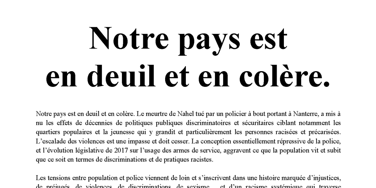 Notre pays est en deuil et en colère. Le meurtre de Nahel tué par un policier à bout portant à Nanterre, a mis à nu les effets de décennies de politiques publiques discriminatoires et sécuritaires ciblant notamment les quartiers populaires et la jeunesse qui y grandit et particulièrement les personnes racisées et précarisées. L’escalade des violences est une impasse et doit cesser. La conception essentiellement répressive de la police, et l’évolution législative de 2017 sur l’usage des armes de service, aggravent ce que la population vit et subit que ce soit en termes de discriminations et de pratiques racistes.