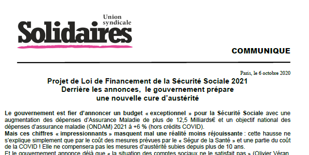 Projet de Loi de Financement de la Sécurité Sociale 2021 : Derrière les annonces, le gouvernement prépare une nouvelle cure d’austérité