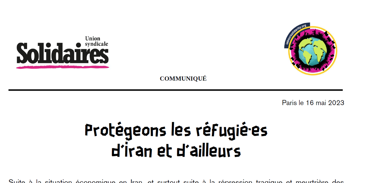 Pour les réfugié·es iranien·nes, comme pour les afghan·es et tou·tes les autres, l'Union syndicale Solidaires dénonce fermement le cynisme du gouvernement français, qui prétend se placer du côté du peuple, mais fait payer aux réfugié·es les conséquences de sa politique raciste anti-migratoire, destinée à séduire l’extrême-droite. Dans l'urgence, et comme le gouvernement a très bien su le faire pour les réfugié·es ukrainien·es, nous exigeons la fin des notifications d'expulsion et demandons à ce qu’il s’engage au plus vite à faire bénéficier les réfugié·es, d'Iran et d'ailleurs, d'un droit d'asile digne, sécurisé, inconditionnel et simplifié.