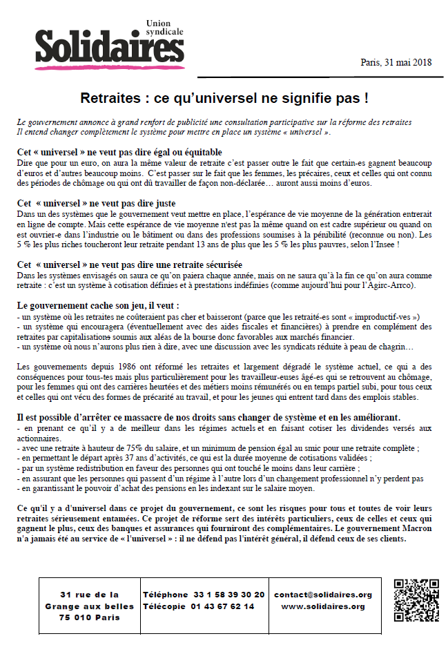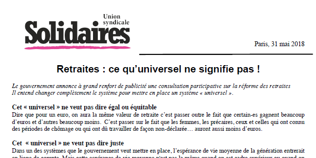 Ce qu'il y a d'universel dans ce projet du gouvernement, ce sont les risques pour tous et toutes de voir leurs retraites sérieusement entamées. Ce projet de réforme sert des intérêts particuliers, ceux de celles et ceux qui gagnent le plus, ceux des banques et assurances qui fourniront des complémentaires. Le gouvernement Macron n'a jamais été au service de « l'universel » : il ne défend pas l'intérêt général, il défend ceux de ses clients.
