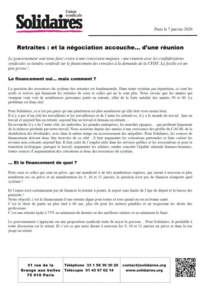 Le gouvernement s’appuyant sur une proposition syndicale tente de noyer le poisson… Pour Solidaires, le préalable à toute discussion est le retrait. Et c’est ce que nous dirons à nouveau les 9, 10 et 11 janvier en grève et dans la rue jusqu’au retrait.