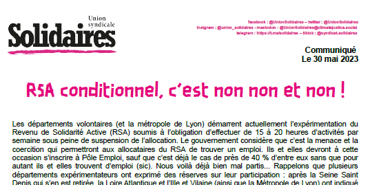 Les départements volontaires (et la métropole de Lyon) démarrent actuellement l’expérimentation du Revenu de Solidarité Active (RSA) soumis à l’obligation d’effectuer de 15 à 20 heures d’activités par semaine sous peine de suspension de l’allocation. Le gouvernement considère que c’est la menace et la coercition qui permettront aux allocataires du RSA de trouver un emploi. Ils et elles devront à cette occasion s’inscrire à Pôle Emploi, sauf que c’est déjà le cas de près de 40 % d’entre eux sans que pour autant ils et elles trouvent d’emploi (sic). Rappelons que plusieurs départements expérimentateurs ont exprimé des réserves sur leur participation : après la Seine Saint Denis qui s’en est retirée, la Loire Atlantique et l’Ille et Vilaine (ainsi que la Métropole de Lyon) ont indiqué qu’ils ne pourraient cautionner un système qui ferait du travail un préalable obligatoire pour toucher le RSA, allocation jusqu’alors inconditionnelle.