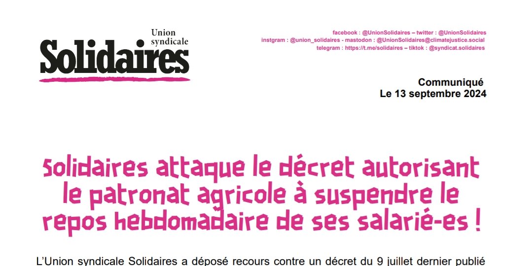 L’Union syndicale Solidaires a déposé recours contre un décret du 9 juillet dernier publié par le gouvernement Attal et qui s’attaque aux droits des salarié·es en reprenant une proposition de loi déposée par l’extrême droite sous pression du lobby viticole. Par ce décret, le patronat agricole est autorisé en effet, sans l’autorisation préalable de l’inspection du travail, à suspendre le repos hebdomadaire de ses salarié-es en cas de circonstances dites « exceptionnelles » qui ne permettent pas de différer la récolte.