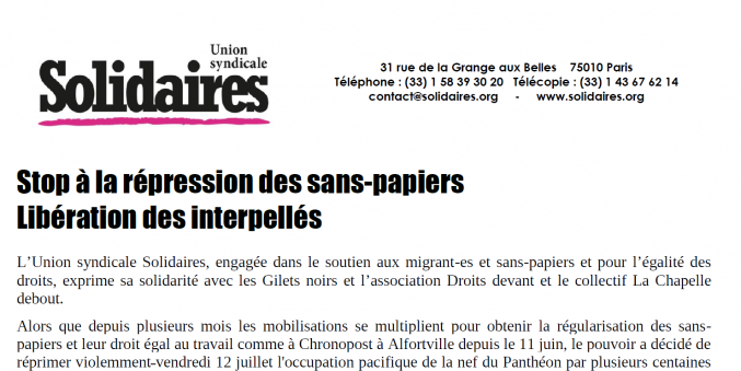 L’Union syndicale Solidaires, engagée dans le soutien aux migrant-es et sans-papiers et pour l’égalité des droits, exprime sa solidarité avec les Gilets noirs et l’association Droits devant et le collectif La Chapelle debout.